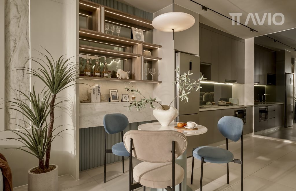 Phong cách tinh tế của căn hộ 2PN1WC lấy cảm hứng thiết kế tựa Cloud Cove – ‘tổ ấm trên mây’, nơi ánh sáng tự nhiên phản chiếu mọi góc nội thất mang lại cảm giác hài hòa, bình yên. Đặc biệt cách bố trí thông minh giúp phòng khách, bàn ăn và bếp hòa làm một, tôn vinh ‘trái tim của tổ ấm’, xóa bỏ ranh giới giữa các khu vực.
